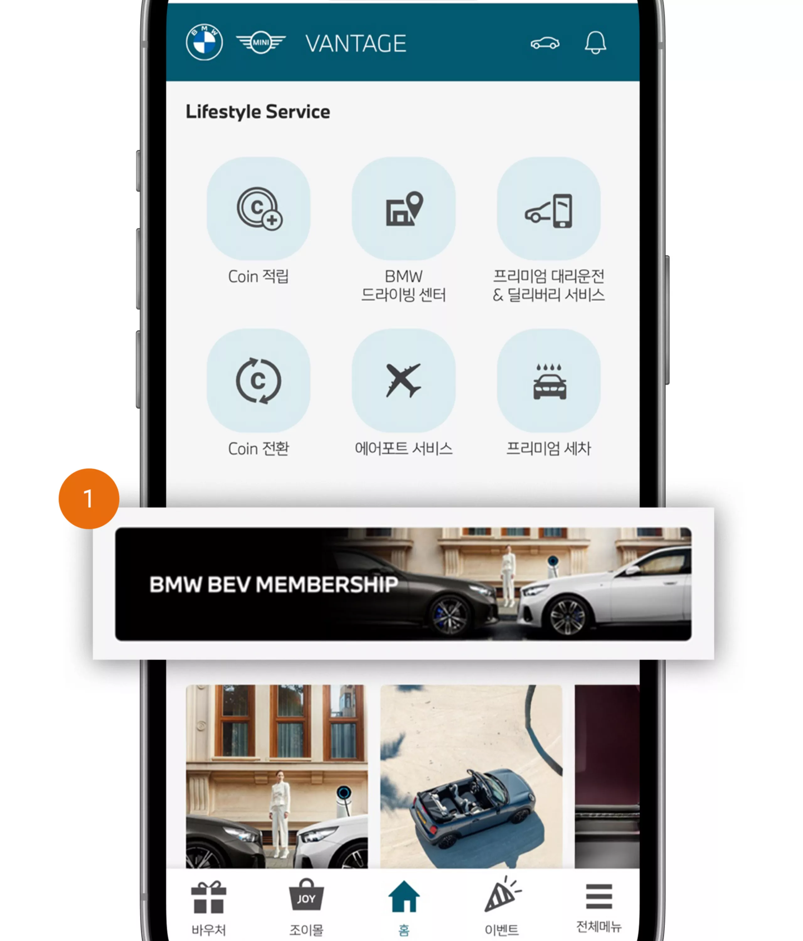 BMW BEV MEMBERSHIP은 밴티지 앱을 통해 예약하실 수 있습니다. 밴티지 앱 가입 후, BMW BEV MEMBERSHIP 배너를 눌러주세요.